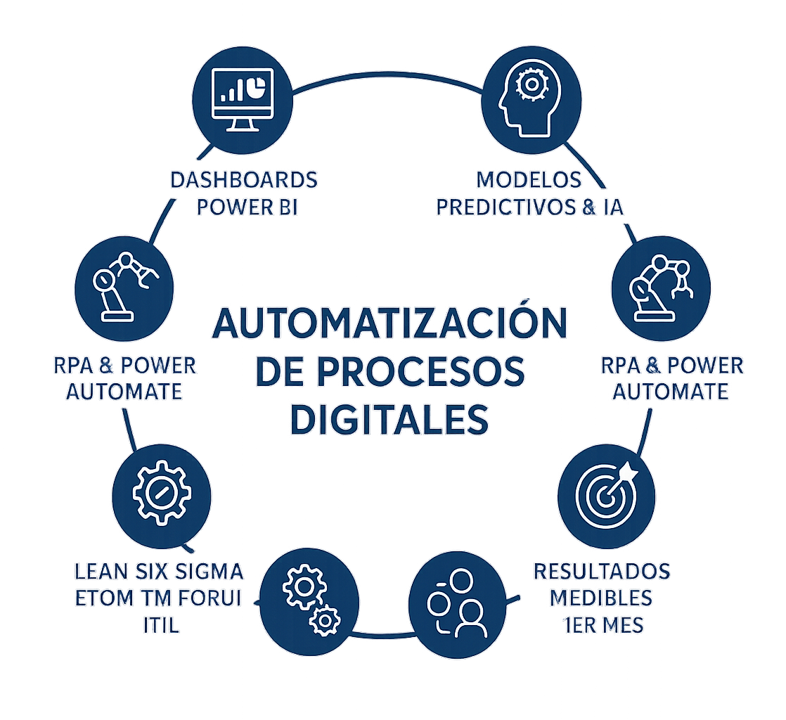 - Optimización Lean & Automatización — estandariza, elimina desperdicios y digitaliza con RPA/IA.